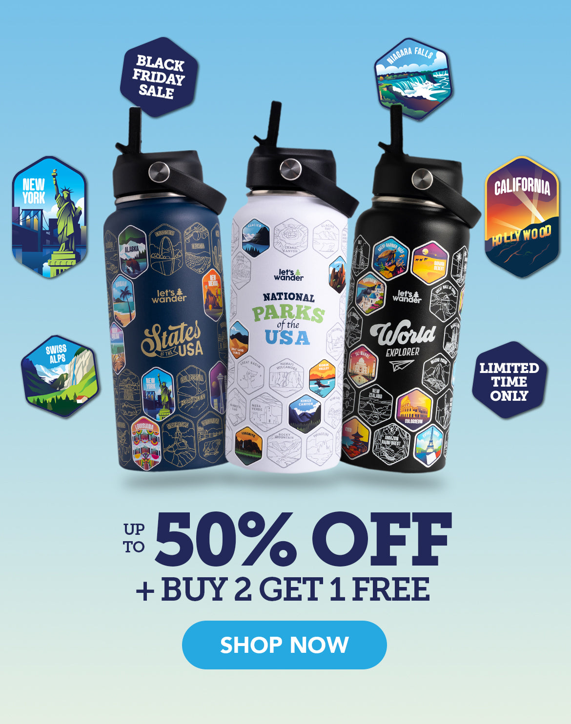 The Let's Wander National Parks Sticker Bottle is made from double-wall vacuum insulated stainless steel.