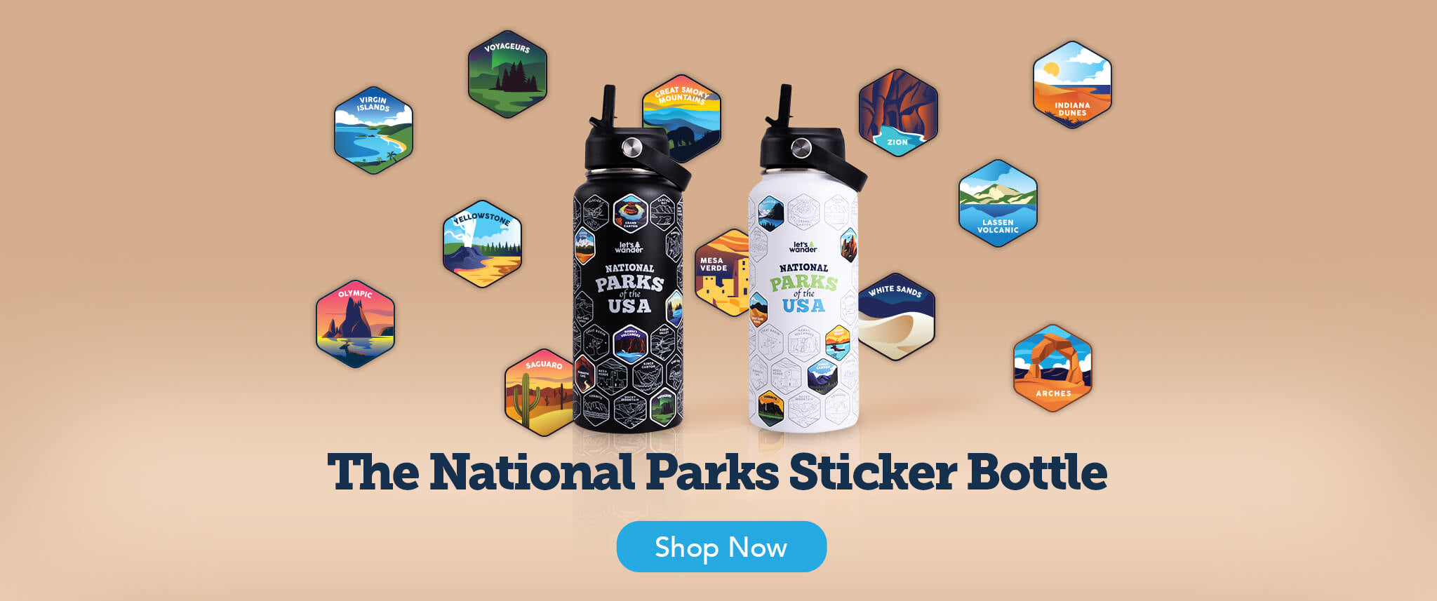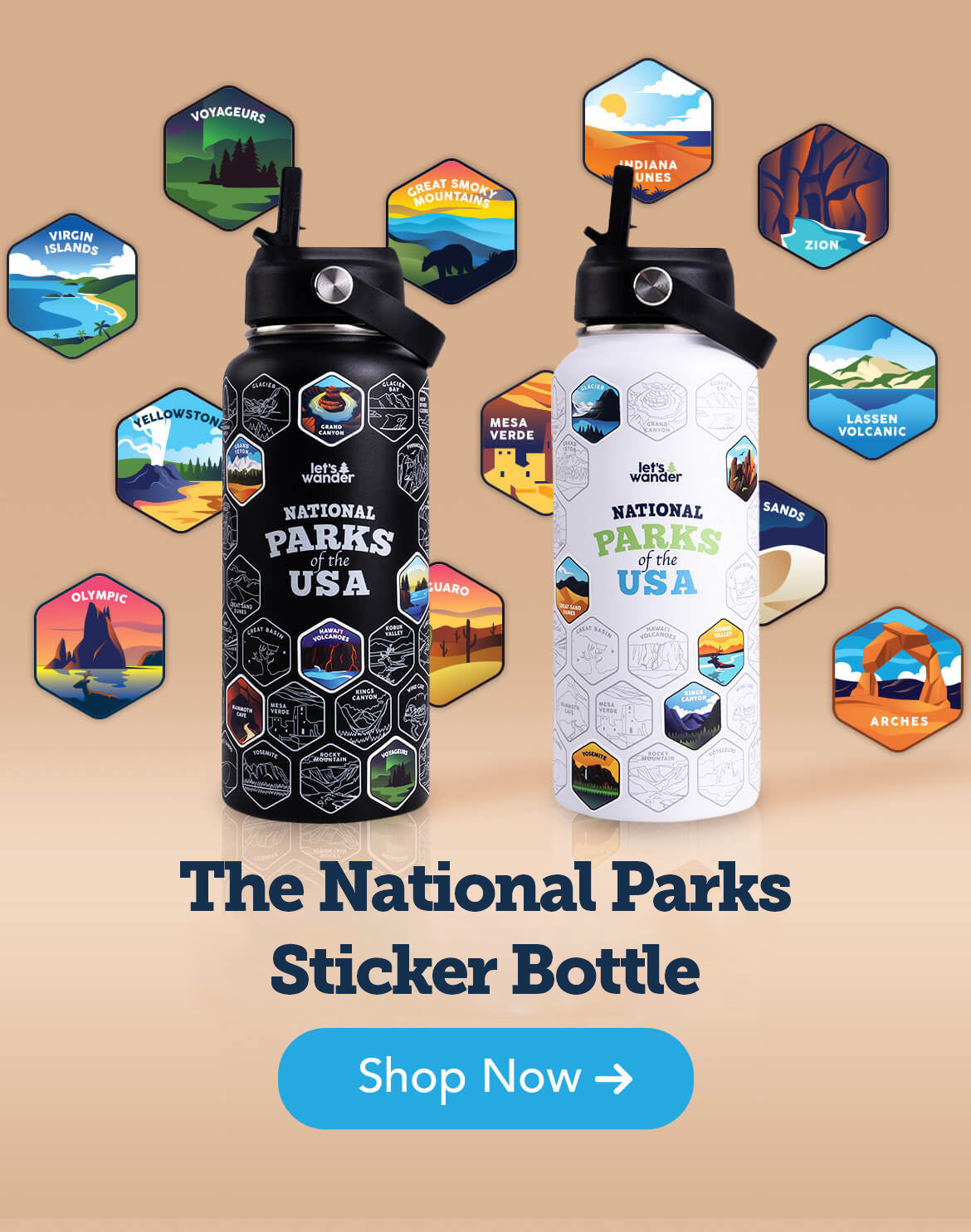 The Let's Wander National Parks Sticker Bottle is made from double-wall vacuum insulated stainless steel.